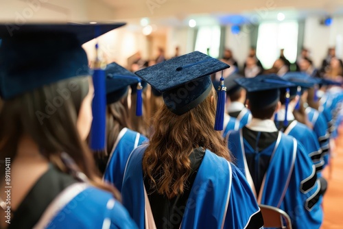 Students in blue graduation regalia sitting during a commencement ceremony, celebrating their academic achievements and receiving their diplomas.