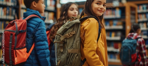 Students with Stylish Backpacks in a School Library, Perfect for Education and Book Storage