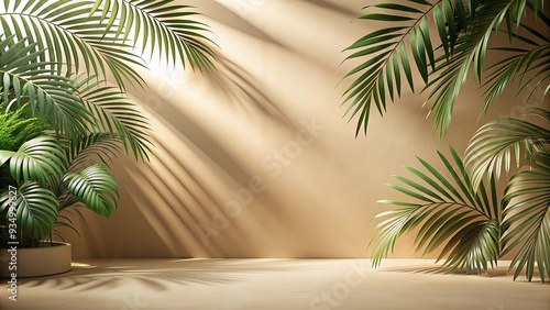 studio background with beige color, tropical leaves, shadows for product presentation,