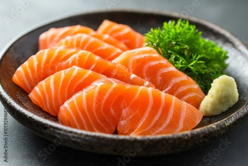 Studio lighting focusing on a plate of Organic Sashimi, highlighting the organic certification and high-quality cuts of fresh seafood