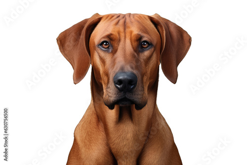 Studio photograph of a Rhodesian Ridgeback, a domesticated canine. The dog is posing for the portrait against a plain white backdrop.