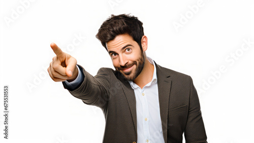 Studio portrait of a man pointing a finger at someone and smiling. Copy the text space.