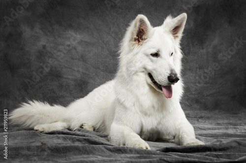 Studio portrait of a nice White Swiss Shepherd dog against neutral background