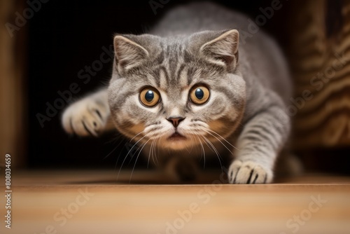 Studio portrait photography of a curious scottish fold cat leaping over rustic wooden floor
