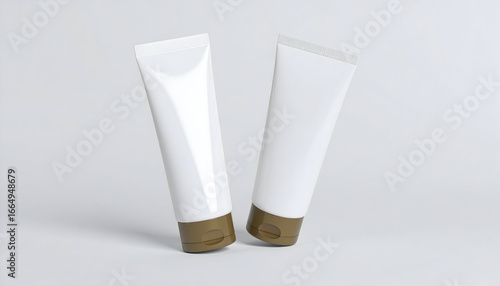 Studio shot of two blank white cosmetic tubes with brown caps, standing against a clean, minimalist background for product mockups.
