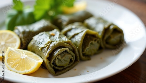 Stuffed grape leaves rolled and served on a white plate with lemon slices and fresh herbs