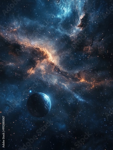 Stunning 3D sci fi illustration of an expansive deep space scene filled with stars and galaxies rendered in high quality 5K