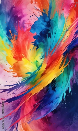 Stunning abstract artwork created with aquarell technique featuring bold colorful strokes and swirling patterns reminiscent of a rainbow, rainbow colors, textured brushstrokes
