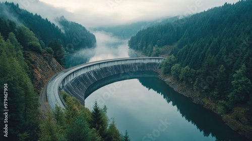 Stunning aerial shot of a concrete dam stretching over a calm lake, bordered by dense green forests and misty mountain ranges