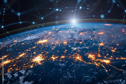 Stunning aerial view of Earth at night showcasing illuminated city lights and global network connections against a dark sky.
