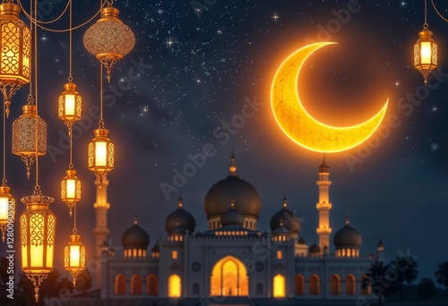 Stunning and elegant Ramadan Kareem background featuring a beautifully lit golden crescent moon and intricate Islamic patterns