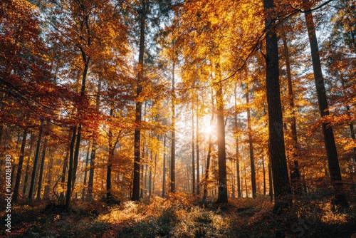 Stunning Autumn Forest with Warm Golden Sunlight and Foliage