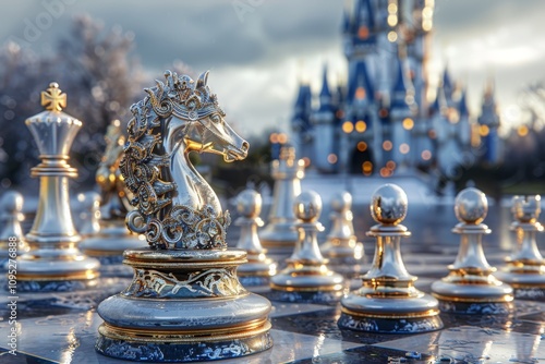Stunning chess set featuring a decorative knight piece with a fairytale castle backdrop at sunset in an enchanting landscape