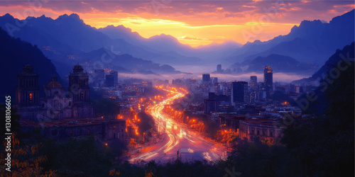 Stunning Cityscape at Dusk with Illuminated Skyline, Majestic Mountains, and Iconic Cathedral Domes on a Colorful Evening Sky Vector Illustration