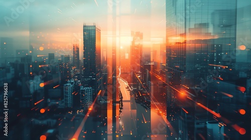 Stunning cityscape at sunset with modern skyscrapers and a vibrant, reflective skyline, showcasing urban architecture and dynamic light effects.