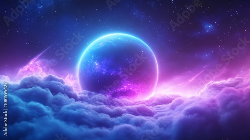 Stunning Cosmic Landscape with Vibrant Nebula and Ethereal Clouds Under a Starry Night Sky, Featuring a Glowing Planet and Celestial Wonders in Lush Colors