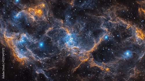 Stunning cosmic nebula with vibrant blue and orange hues against a dark starry background featuring Copy Space for text placement.