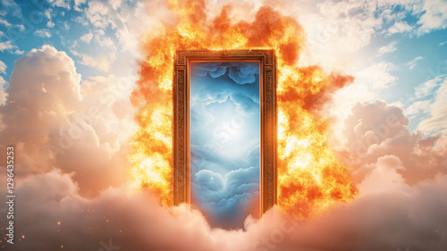 stunning depiction of ancient door surrounded by flames and clouds, symbolizing passage to another realm. vibrant colors and dramatic lighting evoke sense of wonder and mystery