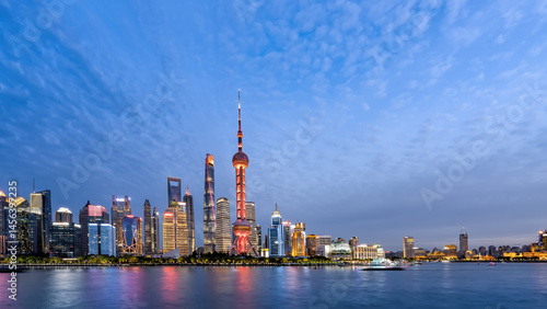 Stunning Evening View of Shanghai Skyline with Illuminated Architecture and Serene Waters