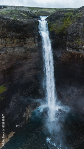 Stunning Haifoss waterfall cascading into a serene pool in Icelands dramatic landscape