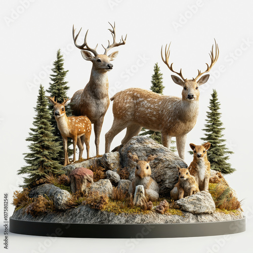 Stunning Illustration of Wild Animals in Nature Surrounded by Greenery and Rocky Terrain Featuring Deer, Fawns, and Forest Elements for Stock Use