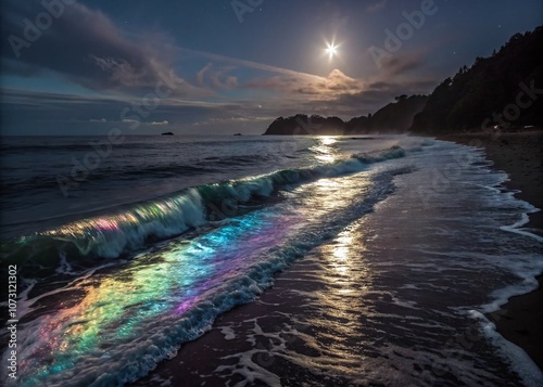 Stunning Night Photography of Smooth Holographic Waves Reflecting Moonlight with Vibrant Colors and Ethereal Light Patterns in a Tranquil Seascape Setting