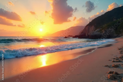 Stunning panoramic view of a tranquil beach at sunset, with soft golden light illuminating the sand and waves Perfect for travel, vacation, and summer themes , serene, vacation