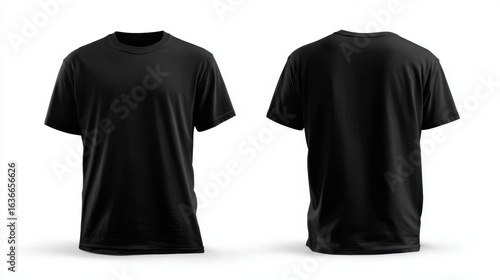 Stunning photo of blank black t-shirt shown front and back, white backdrop, mockup for t-shirt customization and design placement.