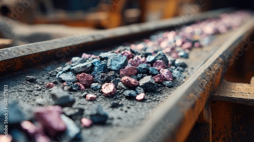 Stunning photo of industrial processing of rare earth elements. Precious metals extracted from ore. Material on conveyor belt. Mining industry. Extraction process. Sustainable.