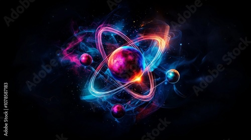 Stunning Quantum Particle Model Illustration Featuring Electrons, Protons, and a Vibrant Cosmic Background, Representing Fundamental Physics Concepts and Awe-Inspiring Energy Dynamics