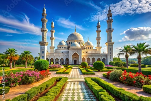 Stunning Side View of a Majestic Mosque Surrounded by Lush Gardens Under a Clear Blue Sky for Stunning
