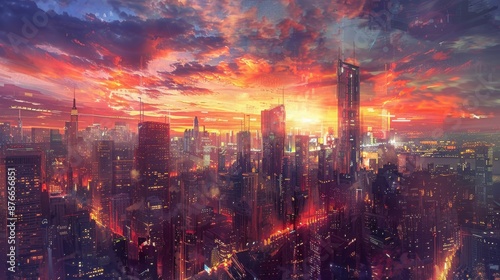 Stunning sunset over a futuristic city skyline, with vibrant colors and towering skyscrapers creating a breathtaking view.