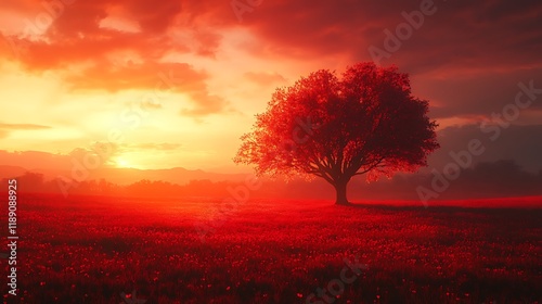Stunning sunset over a vibrant red tree serene field nature landscape