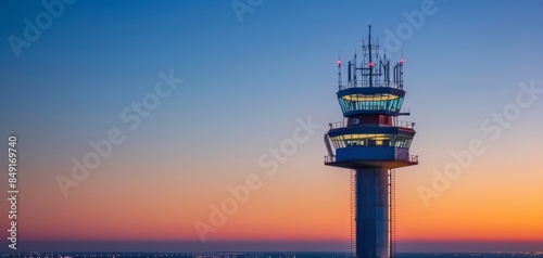 Stunning sunset view of a control tower against a colorful sky, symbolizing aviation, communication, and travel.