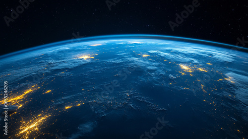 Stunning twilight view of Earth from space with glowing horizon and city lights, cosmic perspective highlighting planet beauty, atmosphere, and universal wonder.