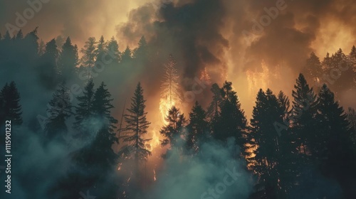 Stunning Ultra HD Image of Smoke Gently Rising Among Lush Green Trees in a Tranquil Forest Setting, Perfect for Nature-themed Projects and Environmental Awareness Campaigns