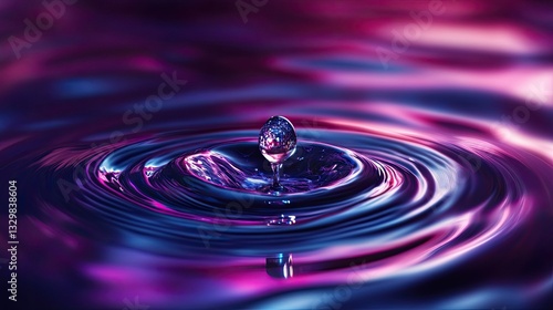 Stunning Vibrant Purple and Blue Water Drop Impacting Surface Creating a Ripple Effect