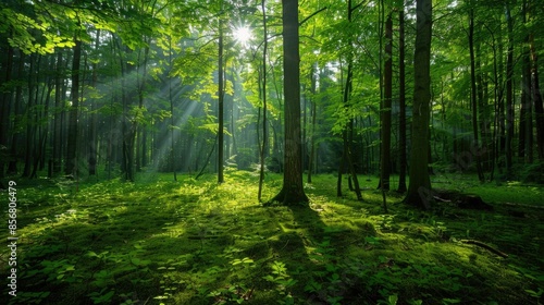 Stunning view of a lush green forest with sunlight filtering through the dense foliage creating a serene and tranquil atmosphere