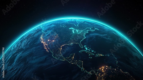 Stunning view of Earth from space, highlighting vibrant continents and glowing city lights against a dark starry backdrop.
