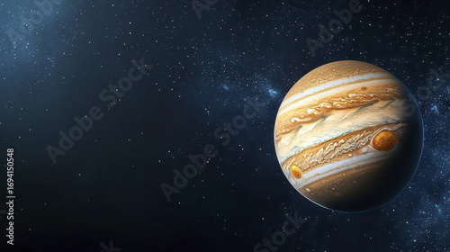 Stunning view of Jupiter, largest planet solar system, showcasing its distinct bands and Great Red Spot against starry