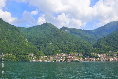 Stunning view of mountains, sky with clouds, village on Lake Como, Italy.