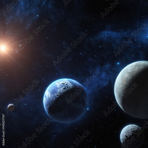 Stunning view of planets, moons, and a bright star in deep space with glowing nebulae and countless stars. Perfect for science, astronomy, and space exploration themes.