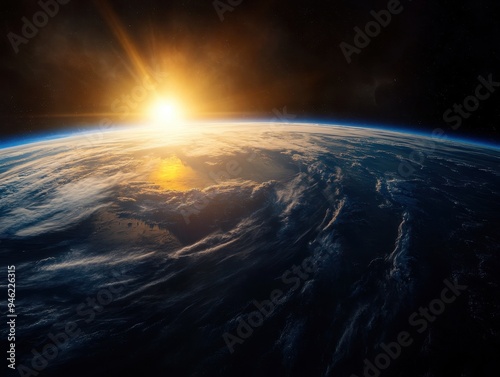 Stunning view of the Earth from space with a radiant sunrise over the horizon. Perfect for themes of exploration and science.