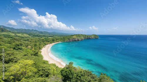 stunning view of tropical beach with clear turquoise waters and lush green hills