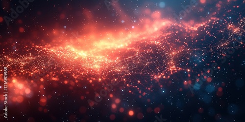 Stunning visualization of a cosmic nebula filled with bright particles and vibrant hues of red and orange in a dark space setting