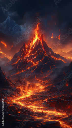 stunning volcano erupts with glowing lava flows, creating dramatic scene