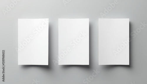 Stunning White Paper Sheets Against Muted Gray Background with Clear Shadows. Three blank white paper sheets on a gray background.