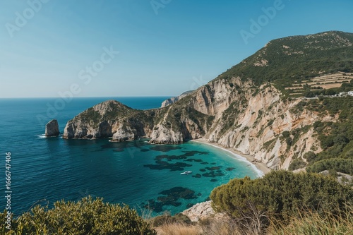 Stunning wide-angle scenery of ocean and rocky cliffs, mountainous terrain by the shore, coastal exploration and natural backdrop, design, surface, aquatic, shoreline, warm season, adventure,