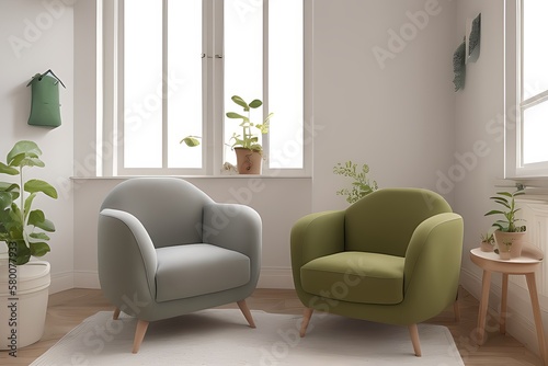 Stylish Armchair and Diffrent Potted Plants, Big Window, Minimalist Interior Design