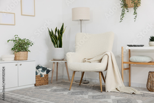 Stylish armchair, lamp, cabinet, console table and houseplants in room. Interior design